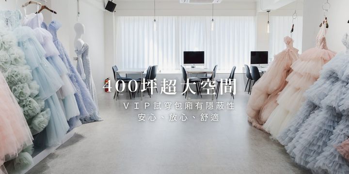 館內約四百坪空間,擁有近七百件禮服,持續汰舊換新。寬敞的試穿環境與具隱私感的更衣室設計,讓新娘能自在享受屬於自己的時刻。每件禮服皆由專業禮服秘書與駐店修改師多重把關,從挑選、修改到出件,層層確認,只為讓每一位新人安心。