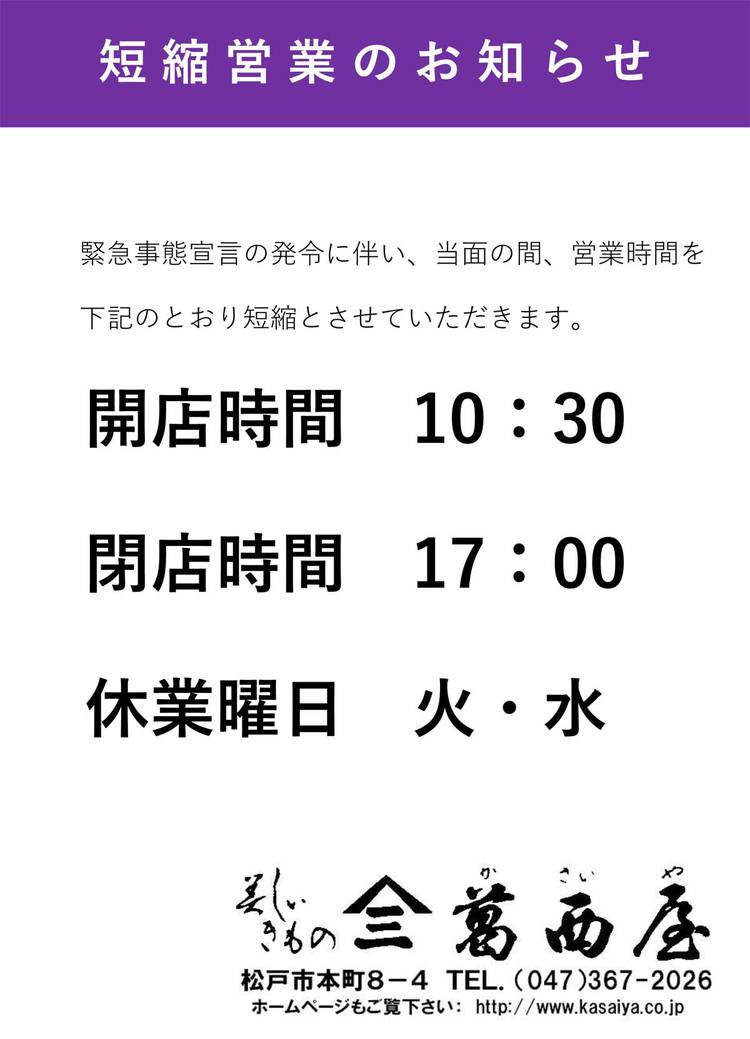 緊急事態宣言発令による営業時間短縮のお知らせ 2021年1月8日(金)より 新型コロナウィルス蔓延防止のための、緊急事態宣言発令に伴い、当面の間、営業体制を下記と通り短縮させていただきます。 開店時間:10時30分 閉店時間:17時00分 休業曜日:火曜・水曜 なお、振袖のお下見などは、他のお客様との重なりを防ぐため、できる限り事前のご予約を賜りますようお願い申し上げます。 営業体制の変更等が行わ...