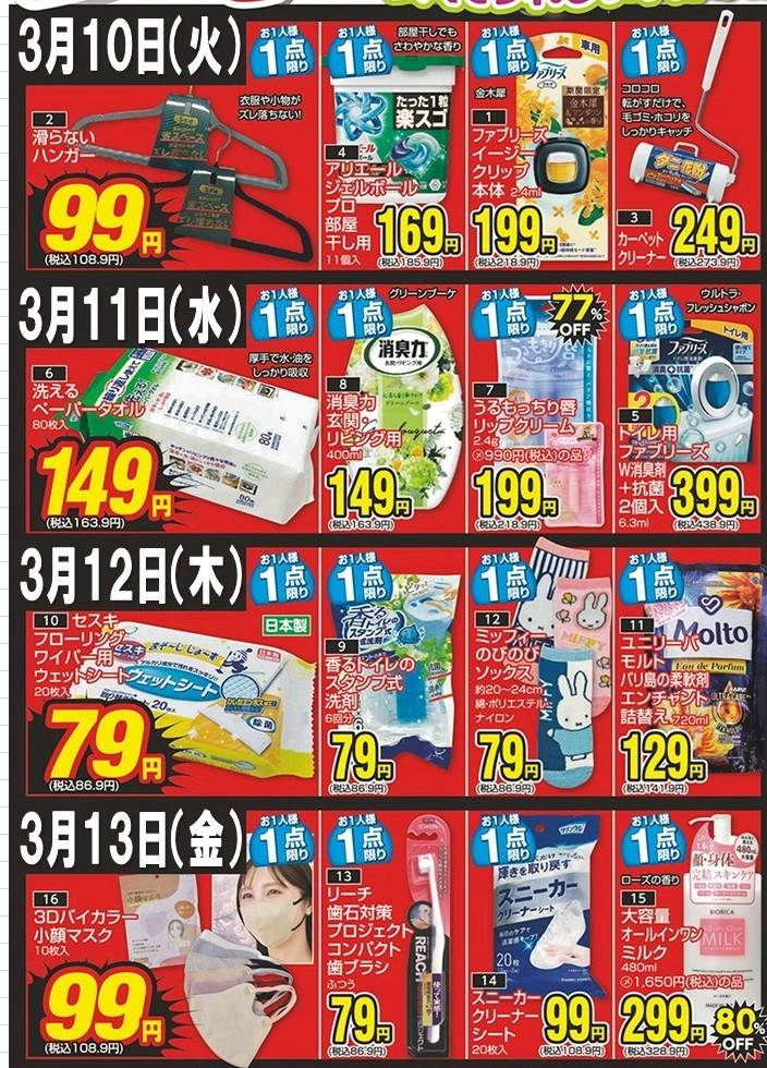衣料品、雑貨を激安で販売しております。 肌着や靴下、タオルやパジャマなど実用衣料も充実! 毎週開催のチラシセールにはびっくりするような超目玉品が目白押しです。