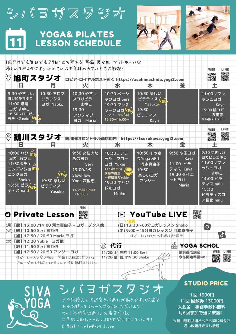 シバヨガNEWS 9月号 こんにちは! ご参加の少ないクラスの整理をちょこっと行ないましたのでスケジュール表にてご確認ください。 🍀スケジュール&ご予約 https://tsurukawa.yogi2.com/schedule/ 🚩特別レッスン ◎9/23㈭㈷ 10:30~90分 ディープリラックスヨガ-季節の変わり目不調対策 河本真由子 +500円 🍀シバヨガの養成講座今冬開講...