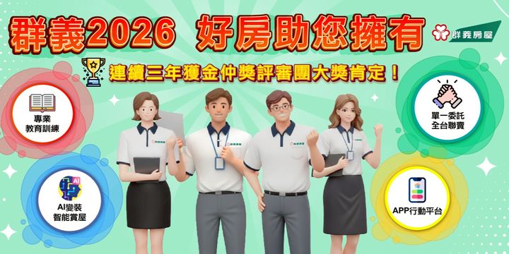 群義房屋是一群房地產仲介菁英,抱著『共同創業』的理想所組成的合作團隊,我們在短短時間內,就創造出好的口碑與績效。十餘年來,在客戶的支持下,我們已是房地產仲介業最有潛力的明日之星。 【榮耀與肯定】 2009年財政部「開立統一發票績優營業人」 2012年台北市「優良商號」 2013年台北市政府勞工局「幸福企業獎」 2014勞動部「工作生活平衡獎-工作悠活獎章」房仲業界唯一榮獲 2014台中市政府樂活職場評選,榮獲「和諧樂活職場」、「優質樂活職場」、「永續樂活職場」三項獎章,房仲業界唯一 2015年度廣告片《群俠行義傳》榮獲Yahoo Big Idea Chair網上創意廣告大獎「最佳影音廣告策略–優選」