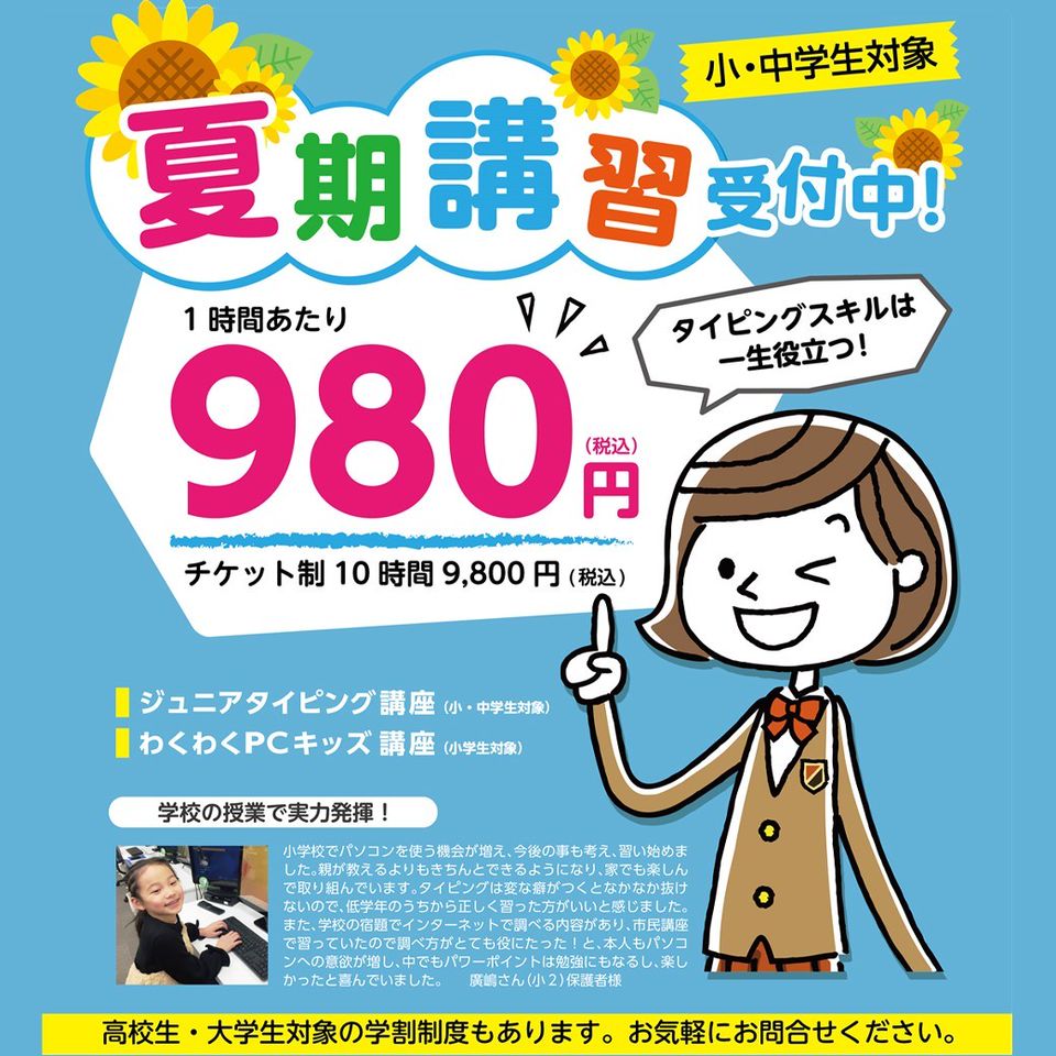 当教室ではパソコンはもちろん、今話題のタブレット端末のiPadまで、全く初めて触る方でも楽しく、わかりやすく学ぶことができる教室です! 特にiPadは基本操作から便利な活用法まで幅広く学ぶことができ、これからiPadを使ってみたい方に 最適なカリキュラムをご用意しています。また、就職に欠かせないパソコン技能を証明する資格対策講座も充実しています。 これまでなんとなく使っていたパソコンやタブレットを私たちと一緒に使いこなしていきましょう!