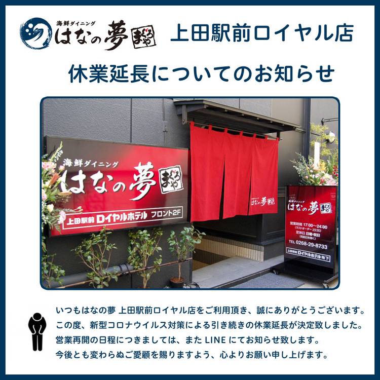 【休業延長のお知らせ】 いつも、はなの夢 上田駅前ロイヤル店をご利用いただき、誠にありがとうございます この度、新型コロナウイルス対策により引き続きの休業延長が決定いたしました。 営業再開の日程につきましては、またLINEにてお知らせいたします。 今後とも変わらぬご愛顧を賜りますよう、心よりお願い申し上げます。