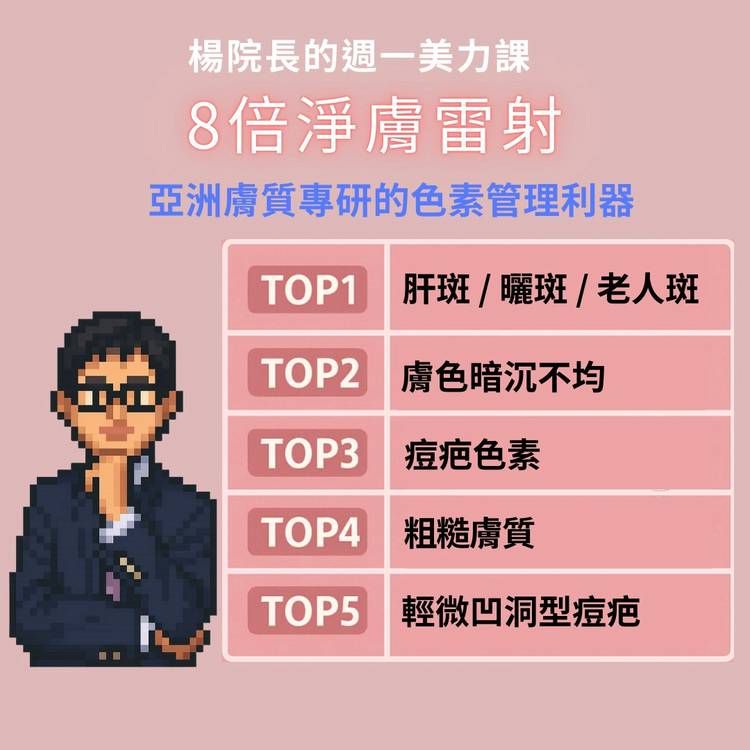 【楊院長的週一美力課】你以為曬斑只是因為防曬沒做好嗎?很現實的是,基因、年紀(40+)、膚色較白的人都有機會,因為皮膚自我修復、防禦紫外線的能力會隨年齡增長逐漸降低。 🕶大家聽過「8倍淨膚雷射」嗎?他專門解決大家最在乎的臉上小缺陷~是韓國知名醫療雷射品牌 Laseroptek 所研發,目前亞洲市場應用最廣泛、最穩定的Q開關Nd:YAG雷射之一。 😎它擁有專利雙模式技術(PTP模式)與穩定的...