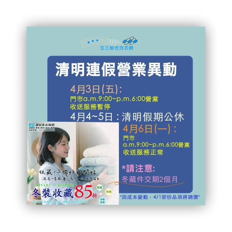 玄三聯合洗衣網是一個運用雲端科技,整合洗衣同業的專業洗衣平台。 無論您到哪裡,您都可以透過玄三聯合洗衣網選擇當地的洗衣商送洗。 目前試營運期間,服務區域為台中七期、八期為主。 合作廠商有:潔屋洗衣聯盟、大官邸洗衣店、重新乾洗店、金冠皮衣廠、玄三快意洗、玄三崑龍和、瑞波地毯清潔公司。 洗衣團隊成員均有廿年以上的豐富經驗。 如果您需要送洗服務,我們都能依據您對價位、品質、交期的需求,為您找到最適合的洗衣商,更方便的是,我們提供了多元的預約方式可下載洗衣風潮APP,或來電預約(04)2252-5824 (04)2254-8893,或搜尋LINE?:@zab7353n加入好友,傳送預約訊息~能在家或將送洗衣物寄放管理室,等待專人為您服務。 現在立馬加入會員,儲值$2000元,除了可享有九折優惠外並且再送您價值$350元的送洗專屬袋唷~是不是非常棒呀~專屬袋數量有限要搶要快~心動不如馬上行動。 想了解我們更多資訊的話 ,快來加入我們的FB紛絲專頁吧~