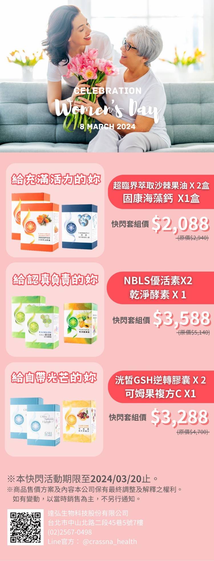 2024年寵愛女神節優惠開跑囉! 即日起至2024/03/20,超划算的優惠套組獻給值得好好被呵護的妳! 快到官方網站看看吧! #女神節快樂 #CrassnaBiotech