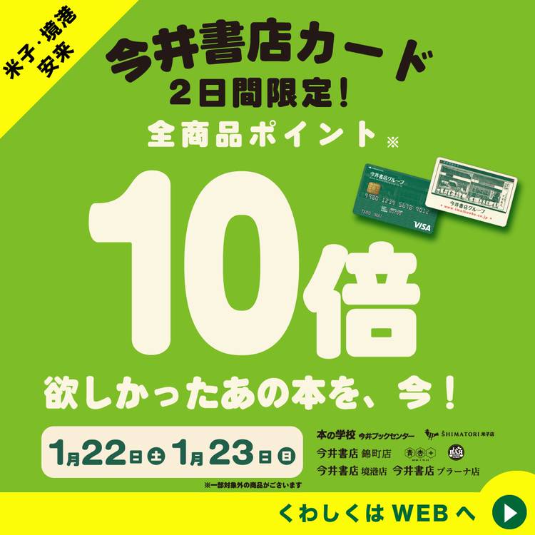 山陰の今井書店です。 本のご案内、イベントのお知らせ、雑貨やカフェのお得情報などお届けします。 メッセージでもお知らせする場合もあります。 ぜひチェックしてくださいね。 ★各店へのアクセス、お問合せは、WEBサイトIMAIBOOKSをご覧ください。 https://www.imaibooks.co.jp/book/?page_id=205 ★今井書店グループ https://www.imaishotengroup.co.jp/ . ※配信内容の無断転載を禁じます。 ※当LINE情報と現品との価格が異なることがあった場合、現品に表示されている価格を商品価格とします。