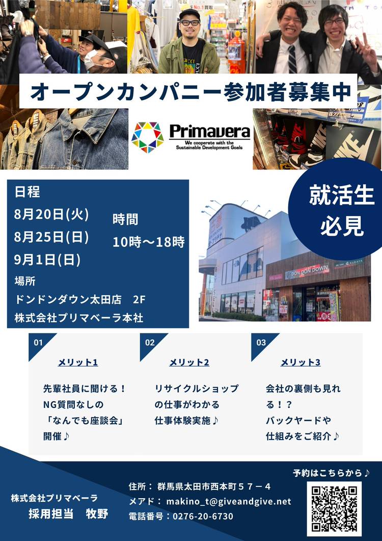 【26卒の就活生必見!!】 株式会社プリマベーラオープンカンパニー開催決定! ドンドンダウン・ヴィンテージバンク・ベクトル・ゴールディーズなど 色々な店舗業態で古着屋・リサイクルショップを運営している 「株式会社プリマベーラ」です。 楽しく成長できる、自分らしさや強みを活かすことのできる会社です! ぜひお友達と一緒にリサイクルショップで働く魅力を感じてみませんか? ぜひ参加してください♪ ...