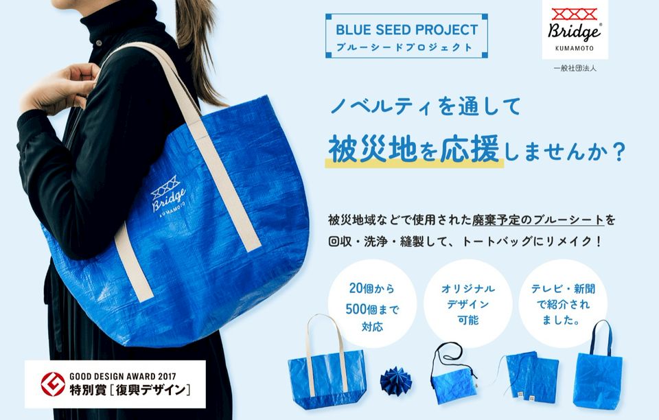 売上の一部は、復興支援団体や社会課題の解決に向けて活動する団体に寄付され、廃棄ブルーシートが復興の種として被災地域へかえる循環型のアイテムです。