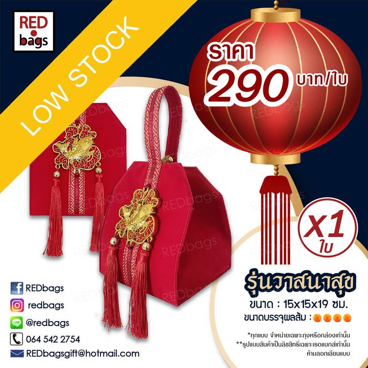 สวัสดีค่ะ ปีนี้ ทาง REDbags ขอนำเสนอถุงผ้าเทศกาลตรุษจีนคอลเลคชั่นใหม่ ที่ตกแต่งด้วยอะไหล่สีทองแวววาวเพิ่มคุณค่าส่งต่อความพรีเมี่ยม(Premium) ให้กับลูกค้าคนสำคัญของทุกท่าน และยังคงตัวอักษรมงคลแทนคำพูดที่มอบให้